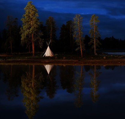 The teepee is constructed at the edge of a lake, reflecting a perfect mirror image in the water. This image is representative of the illusions created by Man and Religion and Source. It’s also representative of the negative hollow side of Life’s Paths. The top of the teepee, where the poles/paths meet …then break off again to form another path and then into open space or nothingness.