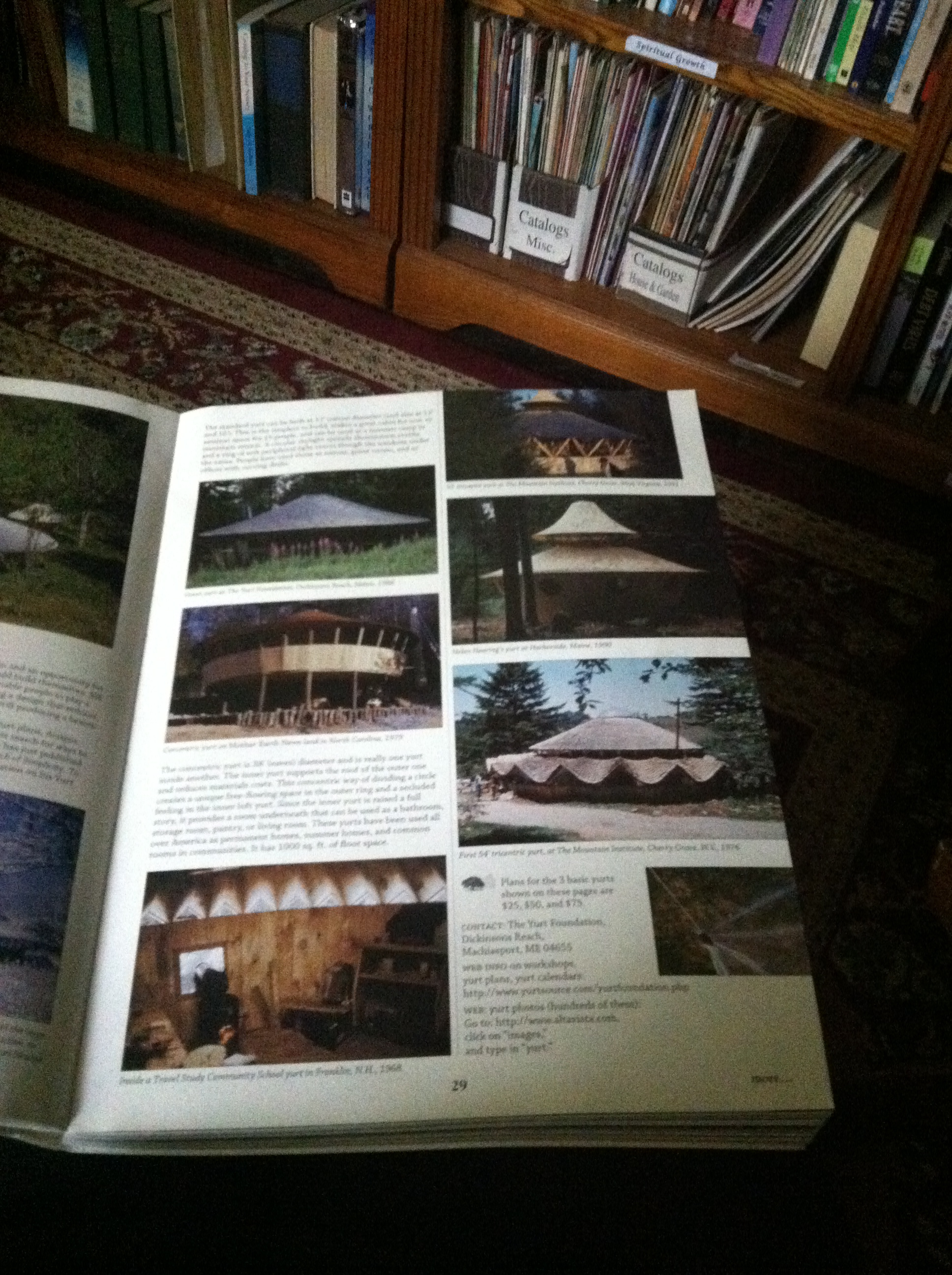 Michael suggested I check out his library as he had a lot of books on rustic shelters and traditional dwellings. The first book I picked up was Home Work: Handbuilt Shelter by Lloyd Kahn…the first page I opened it on was Bill Copperwaite’s Yurts ๐